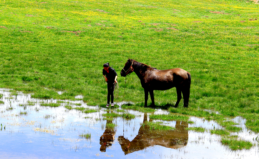 (095号摄影作品)【草甸水镜 人马相依】
