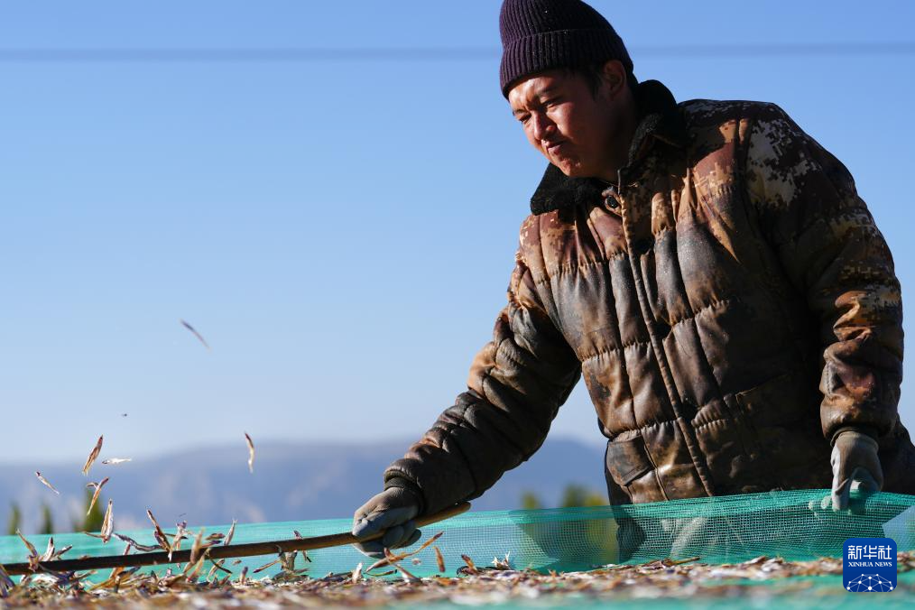 10月18日,在青海省海南藏族自治州共和县龙羊新村龙羊峡海湖渔业捕捞合作社,一名工人将晒好的小银鱼抖散,以防在后续加工中出现粘连。新华社记者 齐芷玥 摄
