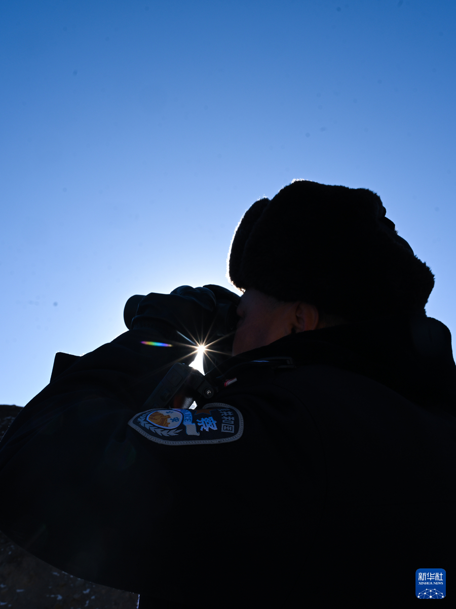 1月9日,在青海省海北藏族自治州门源回族自治县境内的老虎沟,民警郭建业用望远镜查看远处。新华社记者 张龙 摄