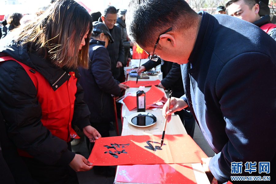 1月14日,青海西宁,书法爱好者在活动现场写对联。