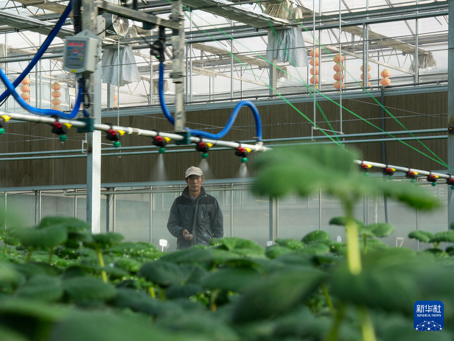在青海省西宁市湟中区,工作人员正在利用水肥一体化设备给草莓种苗浇水。新华社记者杜笑微 摄