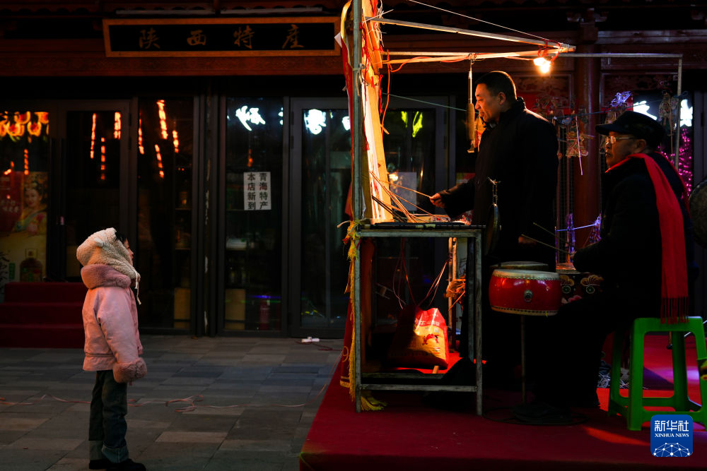1月25日,观众在青海省西宁市城北区观看周邦辉(中)表演皮影戏。新华社记者 齐芷玥 摄