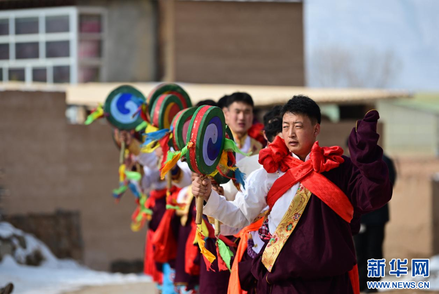 循化县道帏藏族乡贺隆堡村村民在表演鼓舞。新华社记者 张龙 摄
